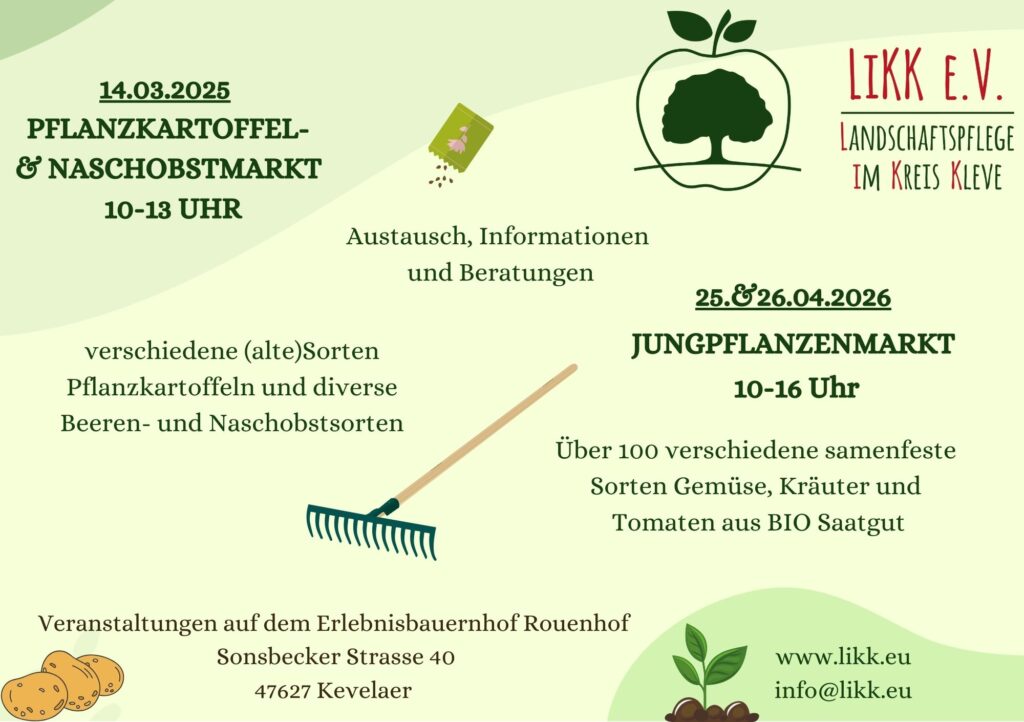 Beim LiKK lautet die Devise „Agieren und nicht Lamentieren“ – mit praktischen Aktionen in der Natur und für die Natur und zahlreichen Workshops (Schnittkurse; Veredelungskurse, Sauerkraut stampfen, Backen im Holzbackofen…) sowie dem großen Jungpflanzenmarkt auf dem Rouenhof in Kervenheim Ende April hat der Verein sich in den vergangenen Jahren einen festen Platz in der Vereinswelt des Kreises Kleve gesichert.